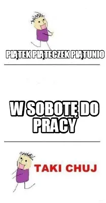 Make your own "Pitek Piteczek Pitunio W Sobot Do Pracy" meme with MemeCreator's free online meme generator. Add text, stickers, and drawings — then download or share. No watermark, no sign-up required.