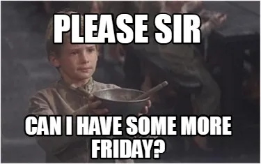 Make your own "Please sir Can I have some more friday?" meme with MemeCreator's free online meme generator. Add text, stickers, and drawings — then download or share. No watermark, no sign-up required.