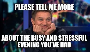 Create Please tell me more About the busy and stressful evening you've had Meme