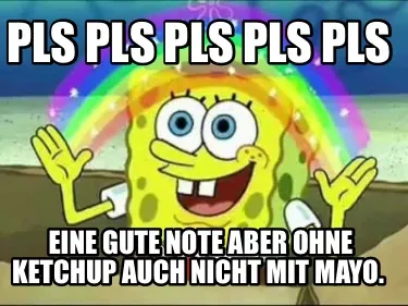 Make your own "Pls pls pls pls pls Eine gute Note aber ohne ketchup auch nicht mit Mayo." meme with MemeCreator's free online meme generator. Add text, stickers, and drawings — then download or share. No watermark, no sign-up required.