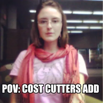 Make your own "Funny POV: cost cutters add" meme with MemeCreator's free online meme generator. Add text, stickers, and drawings — then download or share. No watermark, no sign-up required.