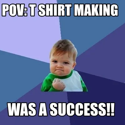 Make your own "Pov: t shirt making was a success!!" meme with MemeCreator's free online meme generator. Add text, stickers, and drawings — then download or share. No watermark, no sign-up required.