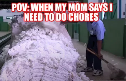Make your own "Funny POV: When my mom says I need to do chores" meme with MemeCreator's free online meme generator. Add text, stickers, and drawings — then download or share. No watermark, no sign-up required.