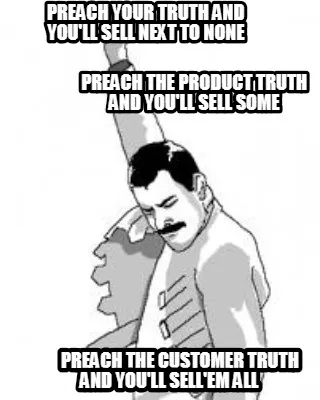 Make your own "PREACH YOUR TRUTH AND YOU'LL SELL NEXT TO NONE PREACH THE PRODUCT TRUTH AND YOU'" meme with MemeCreator's free online meme generator. Add text, stickers, and drawings — then download or share. No watermark, no sign-up required.