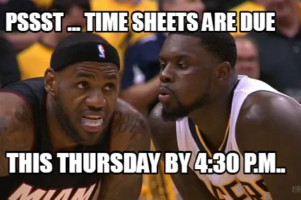 Funny pssst ... Time sheets are due this thursday by 4:30 p.m.. Meme Template