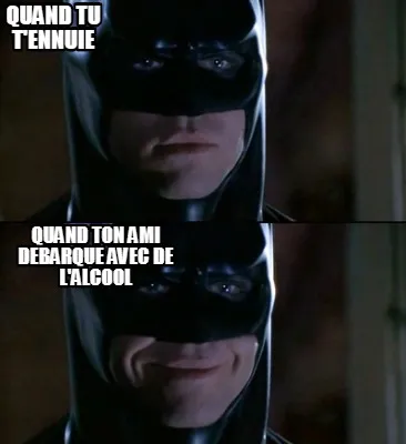 Make your own "Funny QUAND TU T'ENNUIE QUAND TON AMI DEBARQUE AVEC DE L'ALCOOL" meme with MemeCreator's free online meme generator. Add text, stickers, and drawings — then download or share. No watermark, no sign-up required.