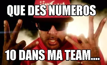 Make your own "QUE DES NUMEROS 10 DANS MA TEAM...." meme with MemeCreator's free online meme generator. Add text, stickers, and drawings — then download or share. No watermark, no sign-up required.