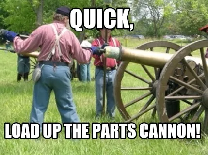 Make your own "Funny Quick, Load up the parts cannon!" meme with MemeCreator's free online meme generator. Add text, stickers, and drawings — then download or share. No watermark, no sign-up required.