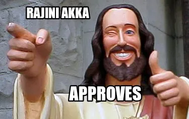 Make your own "Funny Rajini akka Approves" meme with MemeCreator's free online meme generator. Add text, stickers, and drawings — then download or share. No watermark, no sign-up required.