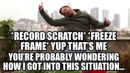 Make your own "*record scratch* *freeze frame* yup that’s me You’re probably wondering how" meme with MemeCreator's free online meme generator. Add text, stickers, and drawings — then download or share. No watermark, no sign-up required.