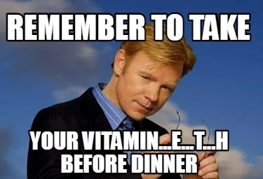 Make your own "REMEMBER TO TAKE YOUR VITAMIN...E...T...H BEFORE DINNER" meme with MemeCreator's free online meme generator. Add text, stickers, and drawings — then download or share. No watermark, no sign-up required.
