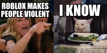 Make your own "Roblox makes people violent I know" meme with MemeCreator's free online meme generator. Add text, stickers, and drawings — then download or share. No watermark, no sign-up required.