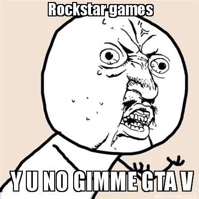 Make your own "Rockstar games Y U NO GIMME GTA V" meme with MemeCreator's free online meme generator. Add text, stickers, and drawings — then download or share. No watermark, no sign-up required.
