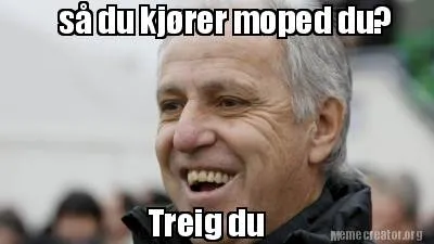 Make your own "Så du kjører moped du? Treig du" meme with MemeCreator's free online meme generator. Add text, stickers, and drawings — then download or share. No watermark, no sign-up required.