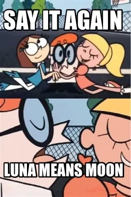 Make your own "Say it again Luna means moon" meme with MemeCreator's free online meme generator. Add text, stickers, and drawings — then download or share. No watermark, no sign-up required.