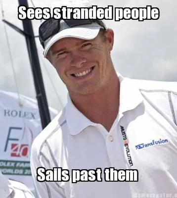Make your own "Sees stranded people Sails past them" meme with MemeCreator's free online meme generator. Add text, stickers, and drawings — then download or share. No watermark, no sign-up required.