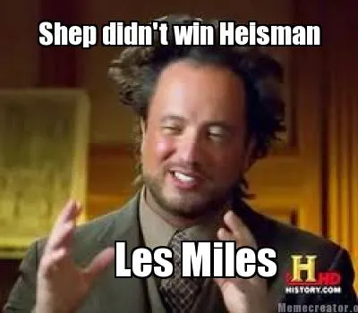 Make your own "Shep didn't win Heisman Les Miles" meme with MemeCreator's free online meme generator. Add text, stickers, and drawings — then download or share. No watermark, no sign-up required.
