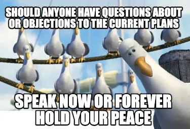 Create Should anyone have questions about or objections to the current plans speak now Meme