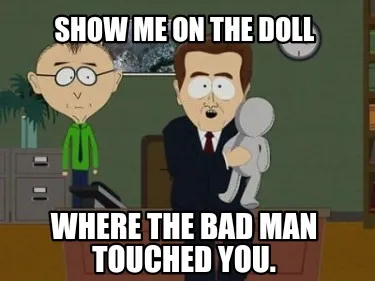 Make your own "Funny Show me on the doll Where the bad man touched you." meme with MemeCreator's free online meme generator. Add text, stickers, and drawings — then download or share. No watermark, no sign-up required.