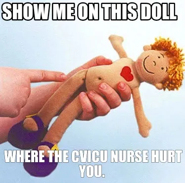 Make your own "Show me on this doll Where the CVicu nurse hurt you." meme with MemeCreator's free online meme generator. Add text, stickers, and drawings — then download or share. No watermark, no sign-up required.