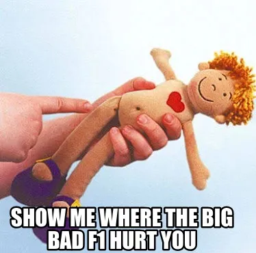 Make your own "Show me where the big bad F1 hurt you" meme with MemeCreator's free online meme generator. Add text, stickers, and drawings — then download or share. No watermark, no sign-up required.