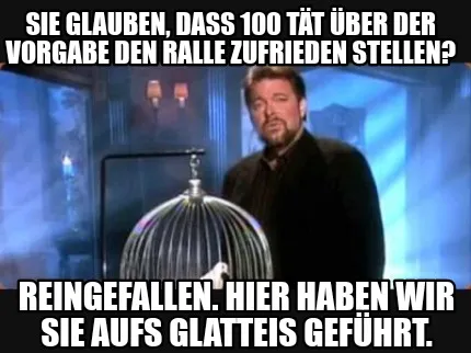 Make your own "Funny Sie glauben, dass 100 Tät über der vorgabe den ralle zufrieden stellen? Reinge" meme with MemeCreator's free online meme generator. Add text, stickers, and drawings — then download or share. No watermark, no sign-up required.