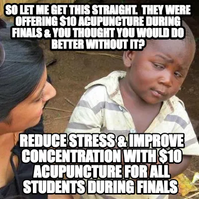 Funny so let me get this straight. they were offering $10 acupuncture during finals & Meme Template