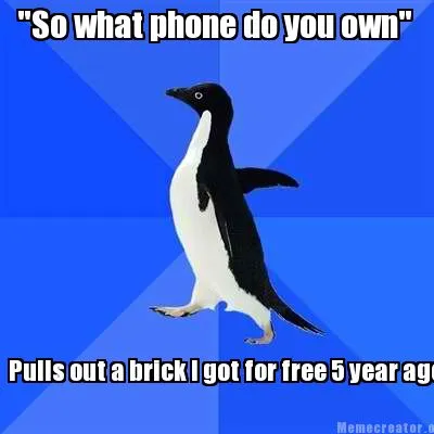 Create "So what phone do you own" Pulls out a brick I got for free 5 year ago Meme