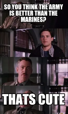 Make your own "So you think the army is better than the marines? Thats cute" meme with MemeCreator's free online meme generator. Add text, stickers, and drawings — then download or share. No watermark, no sign-up required.