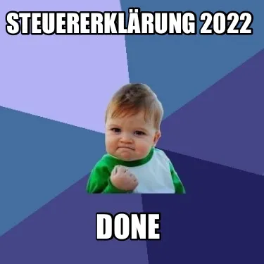 Make your own "Steuererklärung 2022 DONE" meme with MemeCreator's free online meme generator. Add text, stickers, and drawings — then download or share. No watermark, no sign-up required.
