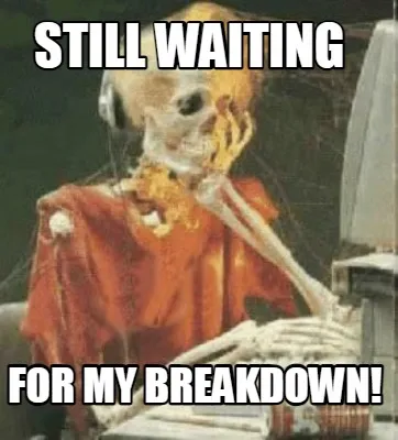 Make your own "Still Waiting For my Breakdown!" meme with MemeCreator's free online meme generator. Add text, stickers, and drawings — then download or share. No watermark, no sign-up required.