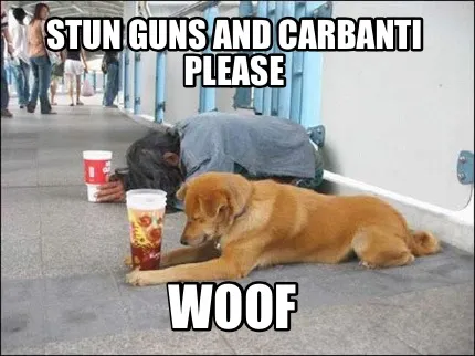 Make your own "Funny Stun guns and carbanti please Woof" meme with MemeCreator's free online meme generator. Add text, stickers, and drawings — then download or share. No watermark, no sign-up required.