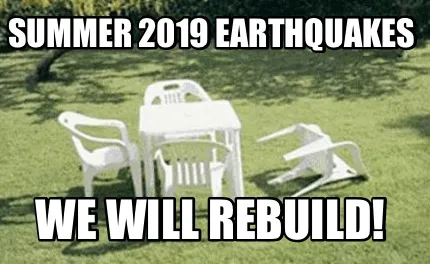 Make your own "Summer 2019 Earthquakes We will rebuild!" meme with MemeCreator's free online meme generator. Add text, stickers, and drawings — then download or share. No watermark, no sign-up required.
