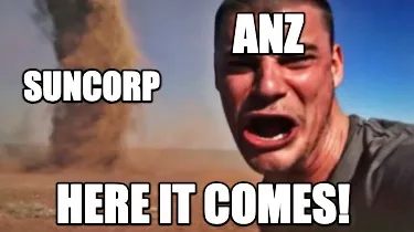 Make your own "Suncorp ANZ Here it comes!" meme with MemeCreator's free online meme generator. Add text, stickers, and drawings — then download or share. No watermark, no sign-up required.