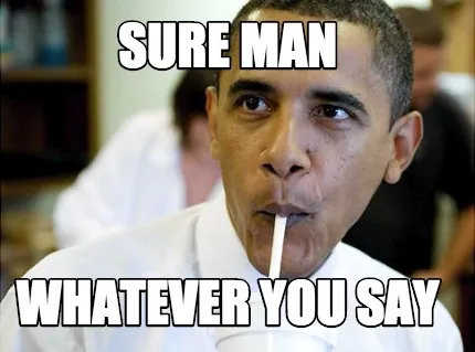 Make your own "Sure Man Whatever You Say" meme with MemeCreator's free online meme generator. Add text, stickers, and drawings — then download or share. No watermark, no sign-up required.