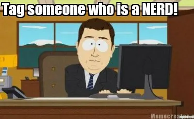 Make your own "Tag someone who is a NERD!" meme with MemeCreator's free online meme generator. Add text, stickers, and drawings — then download or share. No watermark, no sign-up required.