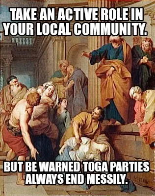 Funny Take an active role in your local community. But be warned toga parties always Meme Template
