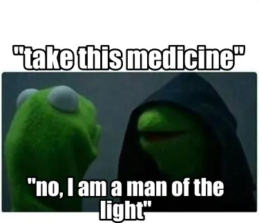 Make your own ""take this medicine" "no, I am a man of the light"" meme with MemeCreator's free online meme generator. Add text, stickers, and drawings — then download or share. No watermark, no sign-up required.