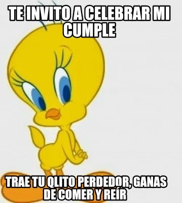 Make your own "Te invito a celebrar mi cumple Trae tu qlito perdedor, ganas de comer y reír" meme with MemeCreator's free online meme generator. Add text, stickers, and drawings — then download or share. No watermark, no sign-up required.