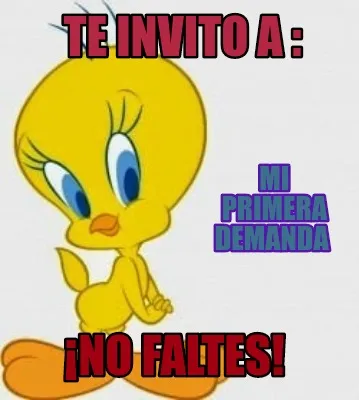 Make your own "Te invito a : ¡No faltes! Mi primera demanda" meme with MemeCreator's free online meme generator. Add text, stickers, and drawings — then download or share. No watermark, no sign-up required.