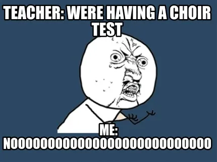 Make your own "Teacher: were having a choir test Me: NOOOOOOoOOOOOOOOOOOOOOOOOOOO" meme with MemeCreator's free online meme generator. Add text, stickers, and drawings — then download or share. No watermark, no sign-up required.