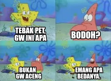 Make your own "Tebak Pet Gw Ini Apa Bodoh Bukan Gw Aceng Emang Apa Bedanya" meme with MemeCreator's free online meme generator. Add text, stickers, and drawings — then download or share. No watermark, no sign-up required.