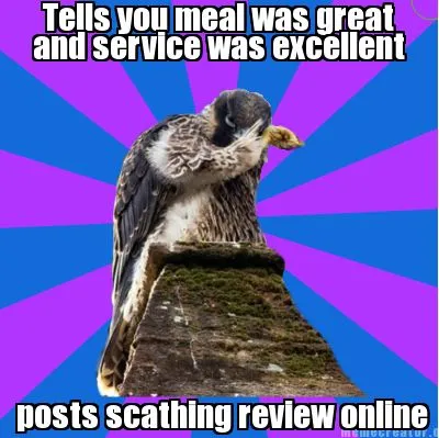 Make your own "Tells you meal was great and service was excellent posts scathing review online" meme with MemeCreator's free online meme generator. Add text, stickers, and drawings — then download or share. No watermark, no sign-up required.
