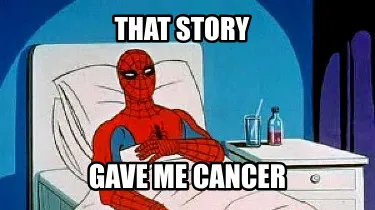 Make your own "Funny That story Gave me cancer" meme with MemeCreator's free online meme generator. Add text, stickers, and drawings — then download or share. No watermark, no sign-up required.