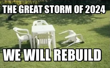 Make your own "The great storm of 2024 We will rebuild" meme with MemeCreator's free online meme generator. Add text, stickers, and drawings — then download or share. No watermark, no sign-up required.
