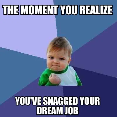 Make your own "Funny The moment you realize you've snagged your dream job" meme with MemeCreator's free online meme generator. Add text, stickers, and drawings — then download or share. No watermark, no sign-up required.