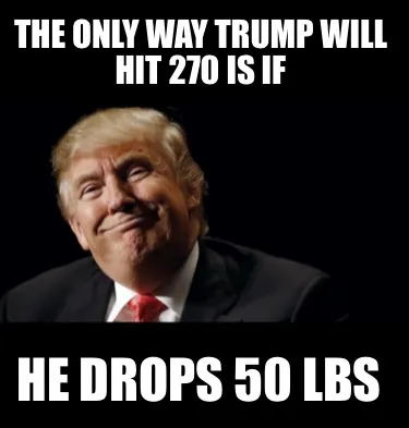 Make your own "The only way Trump will hit 270 is if He drops 50 Lbs" meme with MemeCreator's free online meme generator. Add text, stickers, and drawings — then download or share. No watermark, no sign-up required.