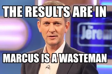 Make your own "Funny The results are in Marcus is a wasteman" meme with MemeCreator's free online meme generator. Add text, stickers, and drawings — then download or share. No watermark, no sign-up required.