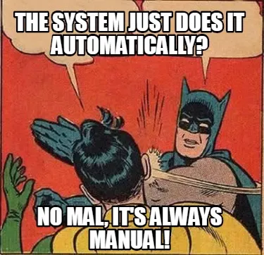 Funny The system just does it automatically? No Mal, it's always manual! Meme Template