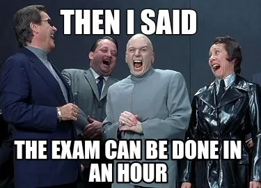 Make your own "Funny Then I said The exam can be done in an hour" meme with MemeCreator's free online meme generator. Add text, stickers, and drawings — then download or share. No watermark, no sign-up required.